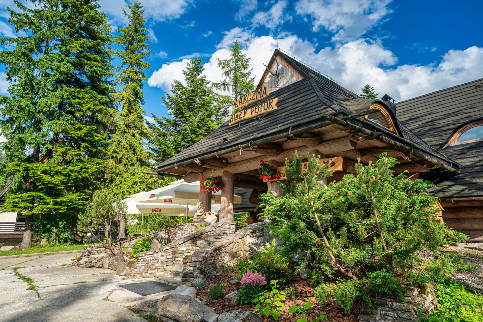 Tuż obok naszych pensjonatów znajduje się karczma regionalna Biały Potok, która swą architekturą idealnie wpisuje się w otaczający krajobraz gór i lasów iglastych. Zbudowana i urządzona w stylu góralskim z licznymi elementami regionu Podhala: skórami, porożami oraz obrazami na szkle cieszy się ogromną popularnością wśród wszystkich tych, którzy cenią sobie niepowtarzalną atmosferę. Na dwóch salach – na parterze i na antresoli - karczma Biały Potok może pomieścić nawet do 150 osób, dzięki czemu stanowi odpowiednie miejsce do organizacji rodzinnych i firmowych imprez okolicznościowych.
